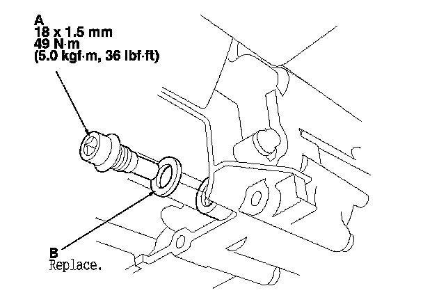 6. Reinstall the drain plug with a new sealing washer (B).