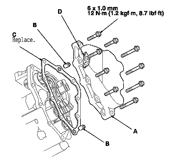 7. Remove the shift solenoid valve cover (A), the dowel pins (B), the gasket (C), and the harness clamp bracket (D).