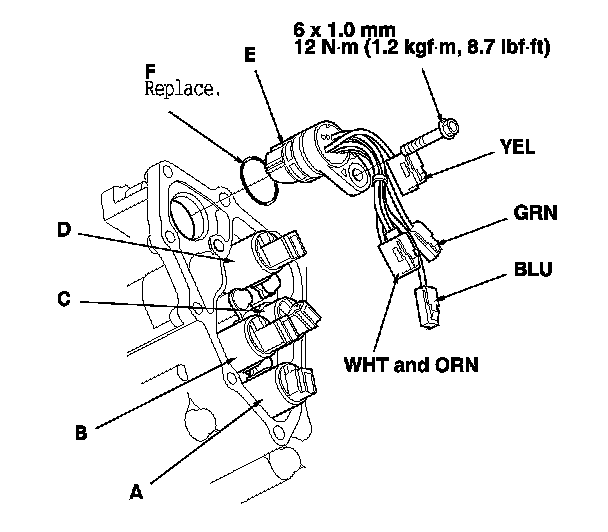 9. Install a new O-ring (F) on a new shift solenoid wire harness, and install the connector in the transmission housing.