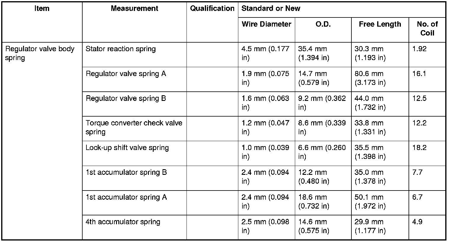 Regulator Valve Body Spring Specifications