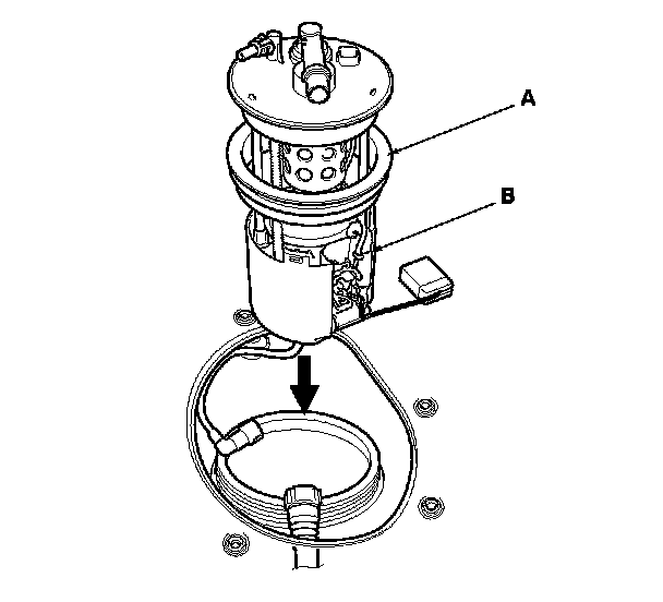 1. Temporarily attach a new base gasket (A) to the fuel tank unit (B), then insert the fuel tank unit partially into the fuel tank.