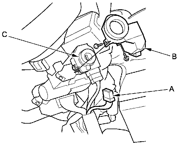 4. Remove the two screws and the immobilizer control unit-receiver from the ignition key cylinder (C).