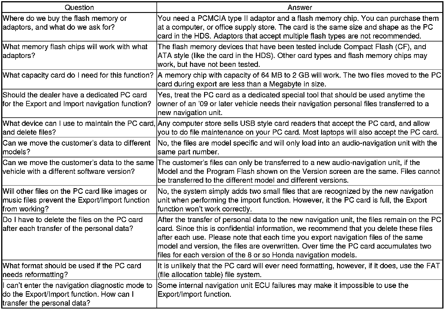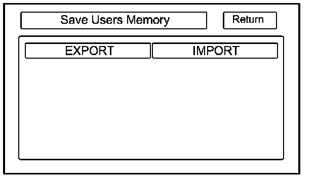 When replacing the audio-navigation unit, this function allows the dealer to transfer the customer's personal data to the new audio-navigation unit. The transferred information includes their Setup settings, and personal addresses. The dealer inserts a PC card to the audio-navigation unit, and then selects the Save Users Memory function. The two functions in this diagnostic screen are EXPORT and IMPORT. EXPORT saves the customer's data to the PC card, and IMPORT moves the PC card files to the new audio-navigation unit.