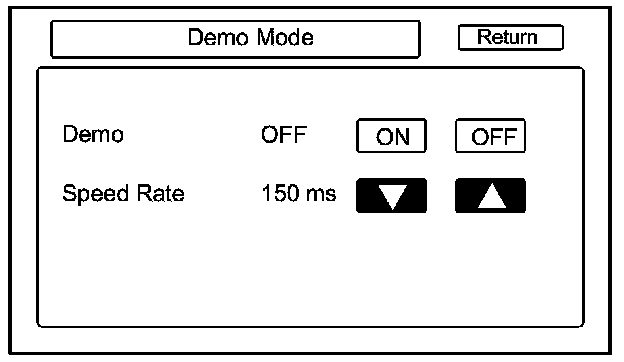 This screen is for factory use only, and should always be set to OFF. Occasionally the DEMO setting is turned ON when vehicles are being used at Auto Shows or similar events. Turning this feature on, allows the navigation system to automatically follow a route to a destination when the vehicle is stationary. The Speed Rate changes the speed of the demo mode.
