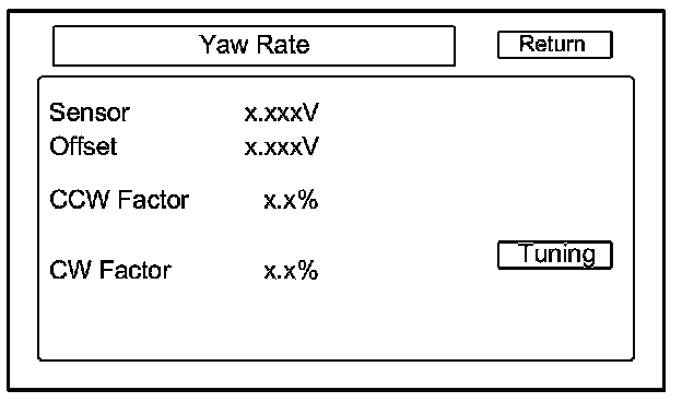 2. Road test: Drive the vehicle on a very straight road. Enter the diagnostic mode, select Yaw rate, and touch the Tuning button. While driving down a straight road, the white dots should trace a straight line across the screen. However, if you are driving on a straight road, and you notice the dots constantly dropping down or heading up as you drive, the audio-navigation unit's yaw sensor is defective. You can touch Reset to clear ANG-Disp, and dotted lines.