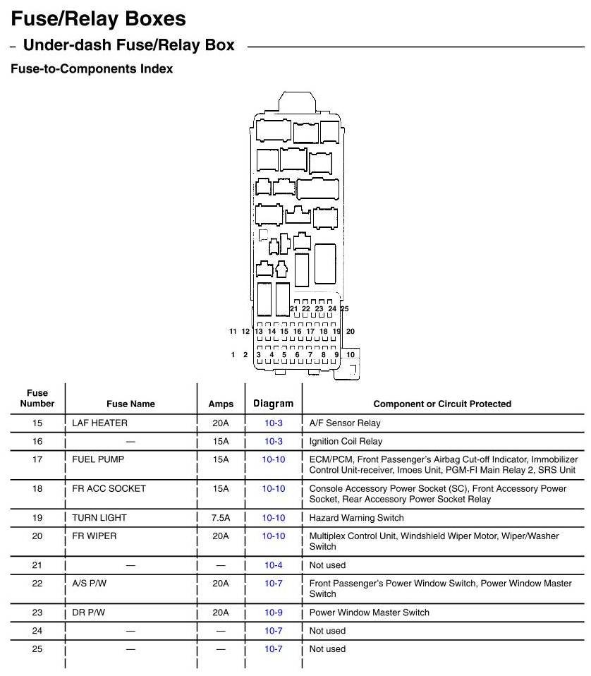 Under-dash Fuse/Relay Box - Fuse-to-Components Index