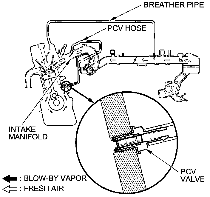 The PCV valve prevents blow-by gasses from escaping into the atmosphere by venting them into the intake manifold.