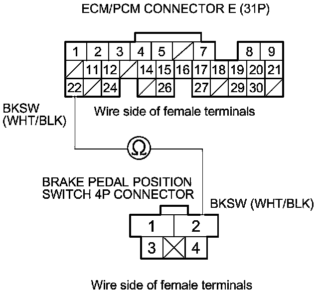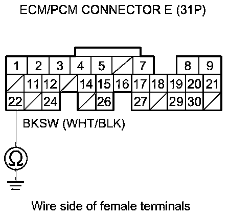 9. Check for continuity between ECM/PCM connector terminal E22 and brake pedal position switch 4P connector terminal No. 2.