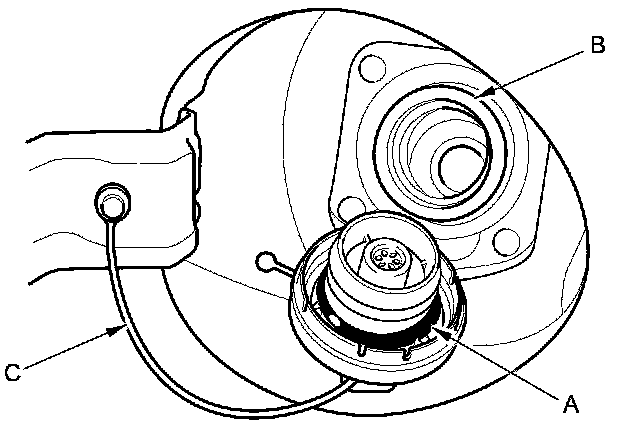 2. Check the fuel fill cap seal (A) and the fuel fill pipe mating surface (B). Verify that the fuel fill cap tether cord (C) is not caught under the cap.