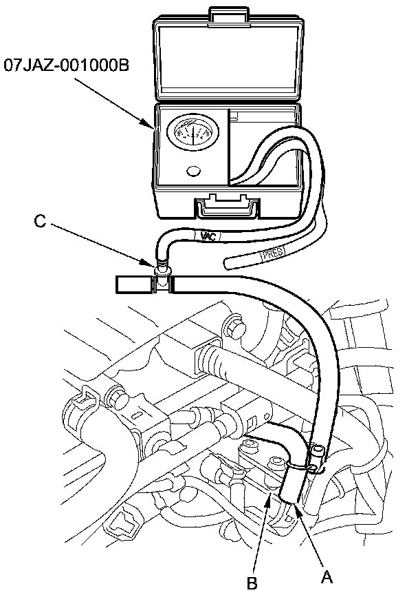 8. Disconnect the vacuum hose (A) from the EVAP canister purge valve (B) in the engine compartment, then connect a T-fitting (C), a vacuum gauge, and a vacuum pump/gauge, 0-30 inHg, to the EVAP canister purge valve as shown.