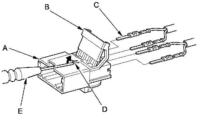 19. Remove the terminal (C) from the connector by pushing the lock tab (D) up in the connector using a thin blade screwdriver (E). Remove all four terminals.