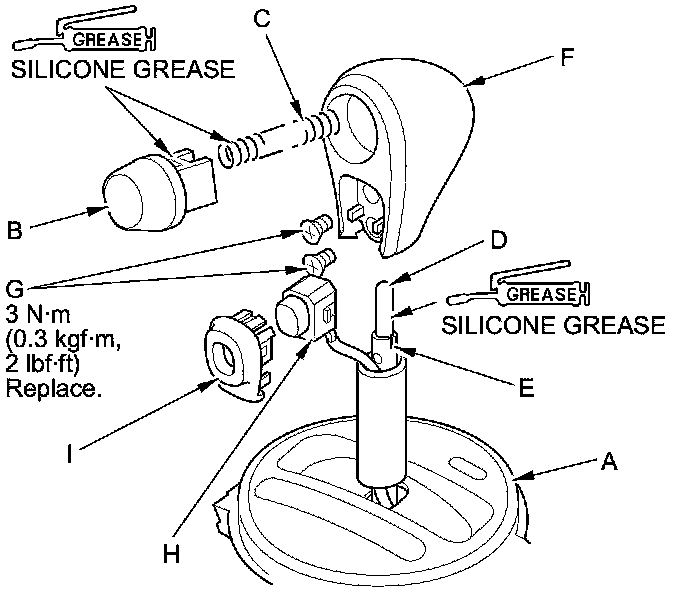 24. Install the A/T gear position indicator panel (A) on the shift lever bracket. Apply silicone grease to the shift lever button (B), the button spring (C), and the push rod (D) of the shift lever (E), and install the button spring, the shift lever button, and the shift lever knob (F). Install new screws (G), and secure the shift lever knob to the shift lever.