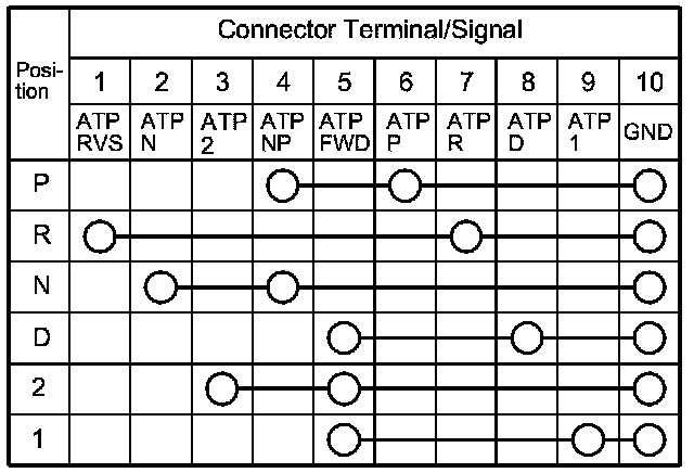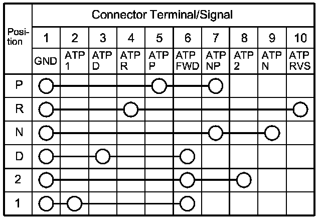 2. Check for continuity between the terminals at the subharness connector. There should be continuity between the terminals in the following table for each shift lever position.