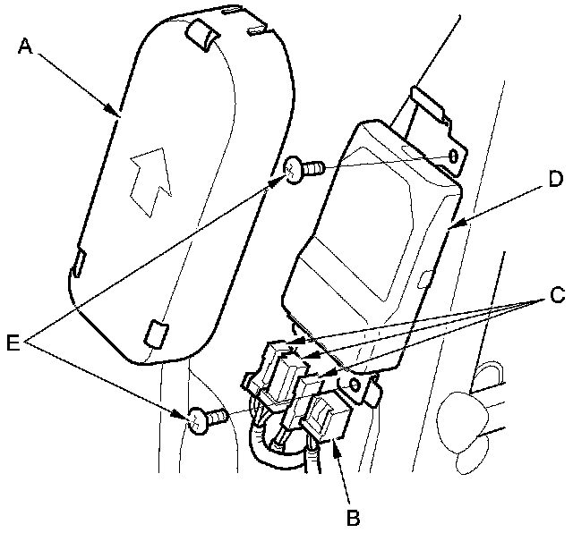 1. Place the ODS unit (A) on the seat-back frame. Tighten the two screws (B), and connect the ODS unit 18P connector (C) and the OPDS sensor connectors (D) to the ODS unit. Reinstall the cover (E).