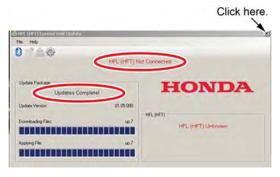 5. The HFL update tool will indicate the update is complete, and disconnect the Bluetooth connection with the HFL control unit. Close the HFL update tool by clicking on the "X" in the upper right-hand corner.