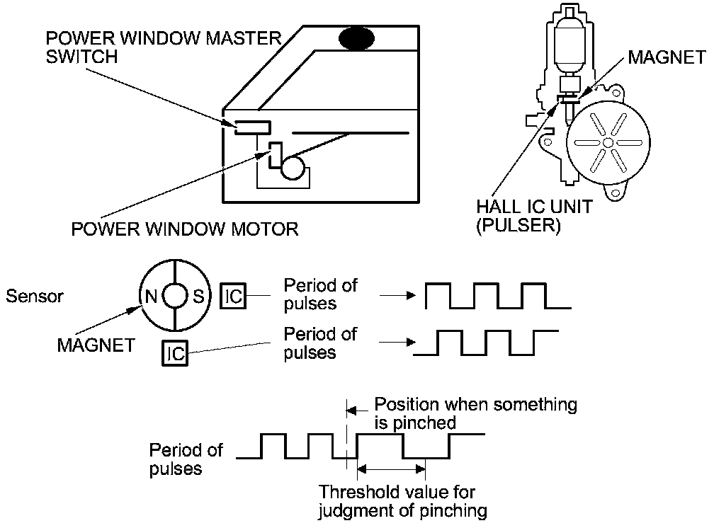 The driver's power window motor incorporates a Hall IC unit (pulser) which generates pulses during the motor's operation and sends the pulses to the driver's power window control unit. As soon as the power window control unit detects a change in the pulse frequency from the Hall IC unit (pulser), the driver's power window control unit makes the power window motor stop and reverse. If the window is more than halfway closed, it will reverse to half open position. If the window is less than halfway closed, it will stop and reverse about 2 in (50 mm). This prevents pinching your hand or fingers during auto-up operation. The auto reverse operation is not active when the switch is held in the up position.