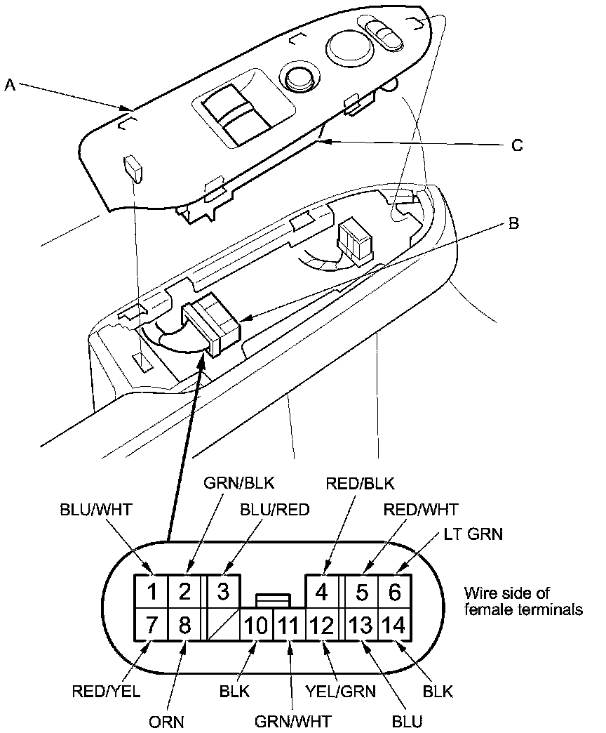 2. Disconnect the 14P connector (B) from the power window master switch (C).