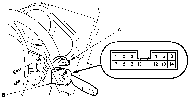 3. Disconnect the 14P connector (A) from the wiper/washer switch (B).