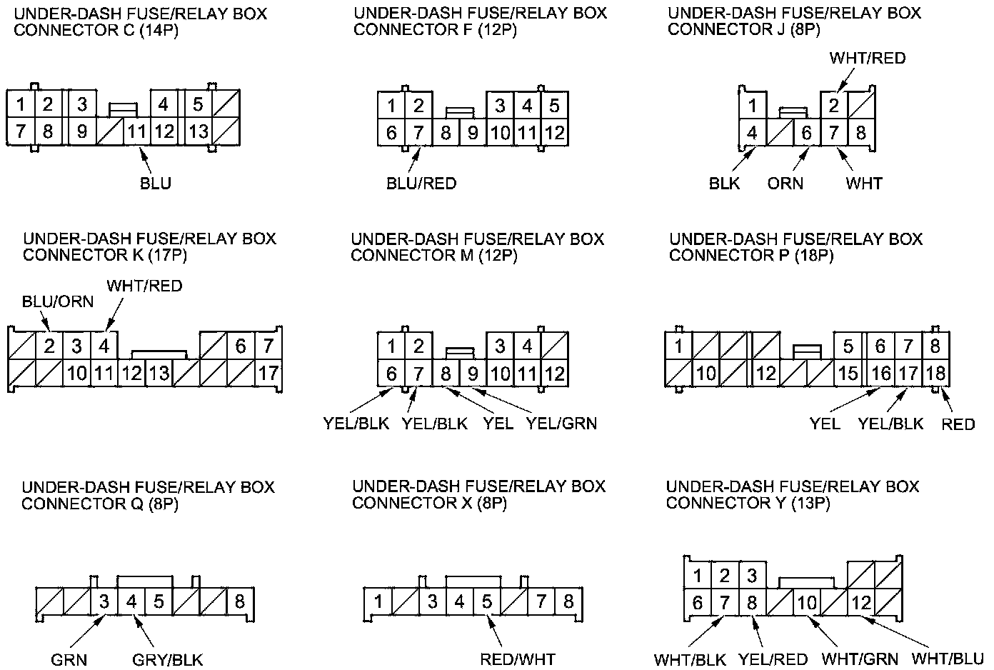 2. Disconnect under-dash fuse/relay box connectors C, F, J, K, M, P, Q, X, and Y.