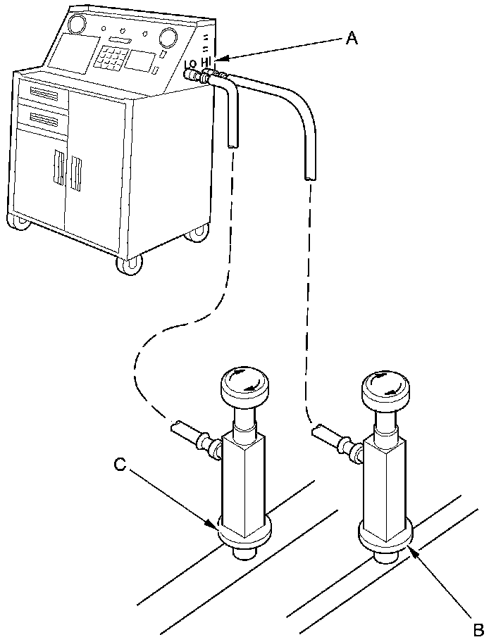 1. Connect an R-134a refrigerant recovery/recycling/charging station (A) to the high-pressure service port (B) and the low-pressure service port (C), as shown, following the equipment manufacturer's instructions.