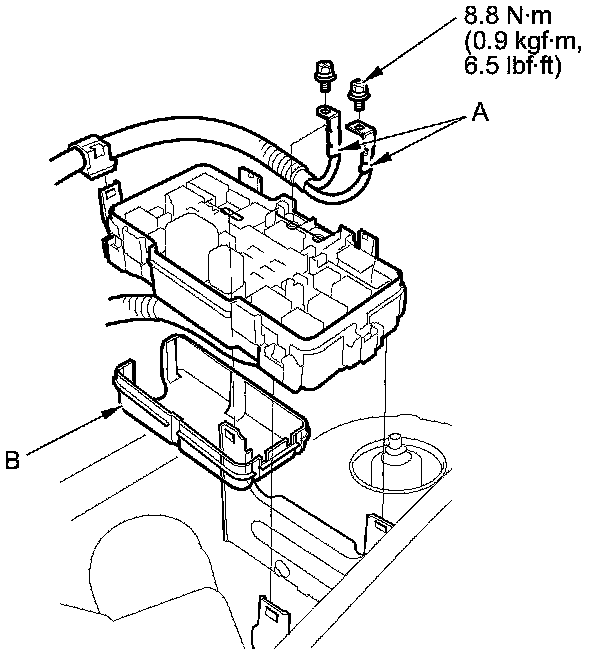 4. Remove the under-hood fuse/relay box lower cover (B) from the fuse/relay box.
