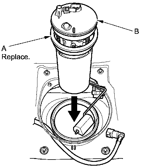 1. Temporarily attach a new base gasket (A) to the fuel tank unit (B), then insert the fuel tank unit into the fuel tank.