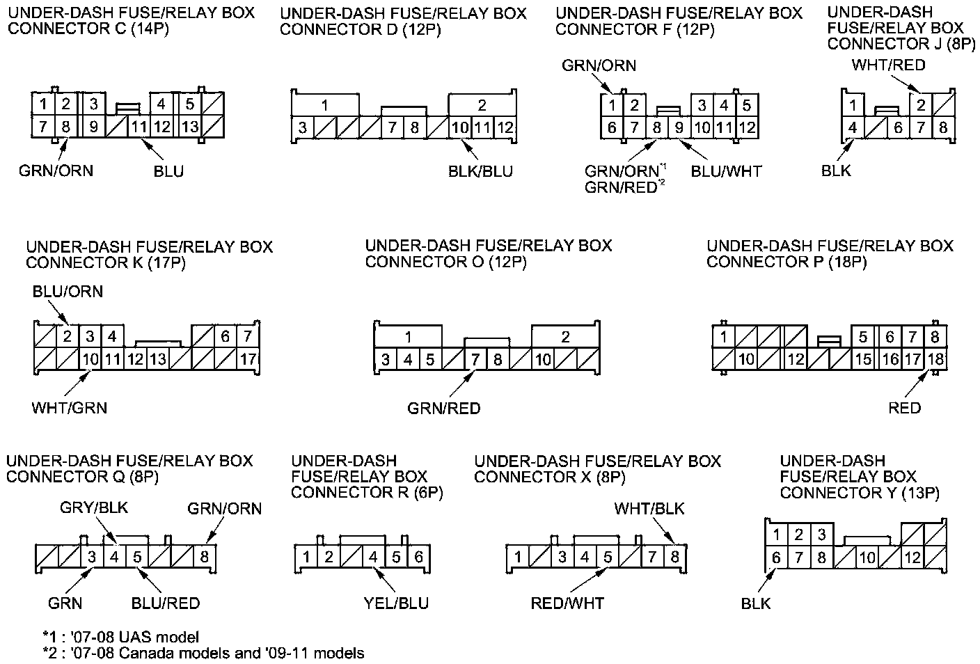 2. Disconnect under-dash fuse/relay box connectors C, D, F, J, K, O, P, Q, R, X, and Y.