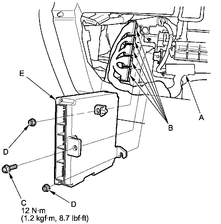 16. Remove the nuts (D), then remove the ECM/PCM (E).