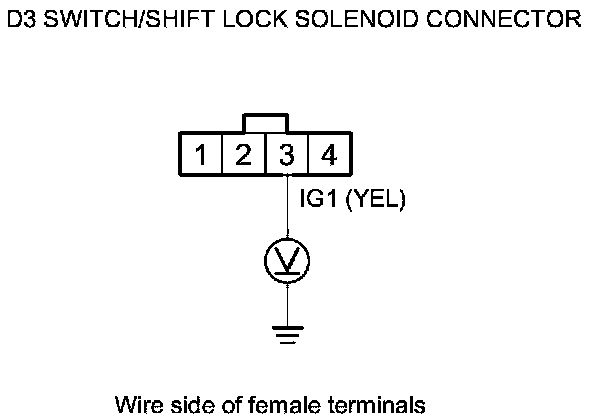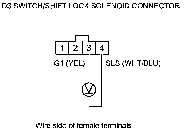 7. Measure the voltage between D3 switch/shift lock solenoid connector terminal No. 3 and body ground.