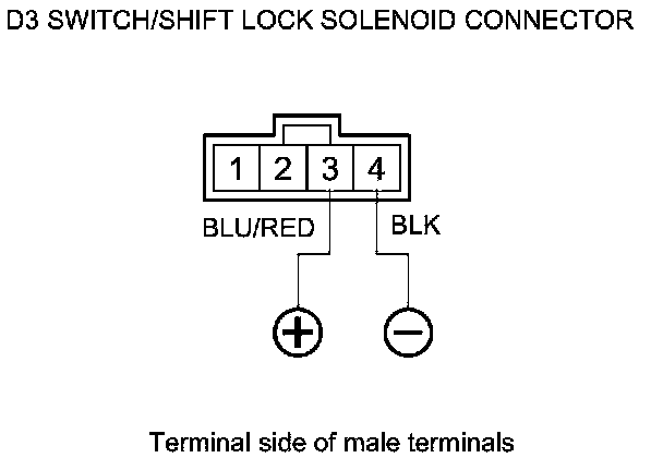 NOTE: Do not connect the battery positive terminal to terminal No. 4 or you will damage the diode inside the shift lock solenoid.