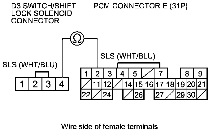13. Check for continuity between PCM connector terminal E2 and D3 switch/shift lock solenoid connector terminal No. 4.