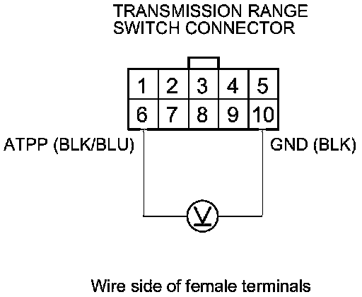 20. Measure the voltage between transmission range switch connector terminals No. 6 and No. 10.