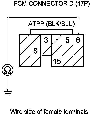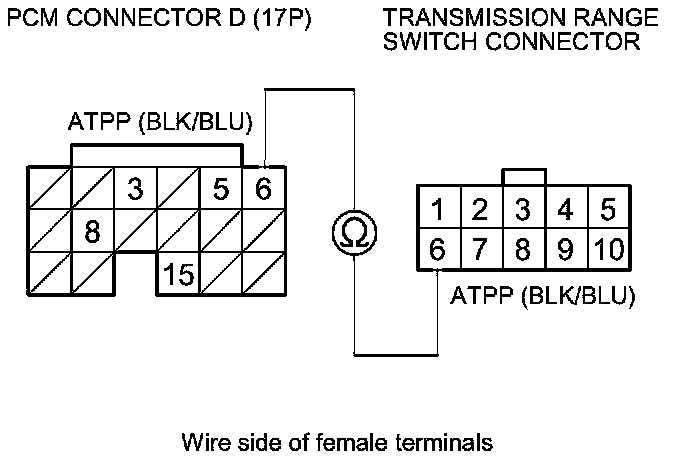 25. Check for continuity between PCM connector terminal D6 and transmission range switch connector terminal No. 6.
