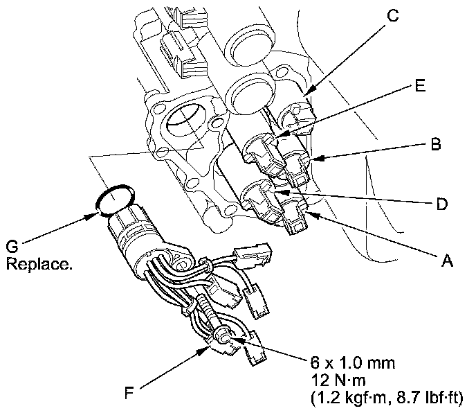 8. Disconnect the shift solenoid valve connectors from the shift solenoid valves. Then replace the ATF temperature sensor/shift solenoid wire harness assembly (F) and the O-ring (G) with new ones.