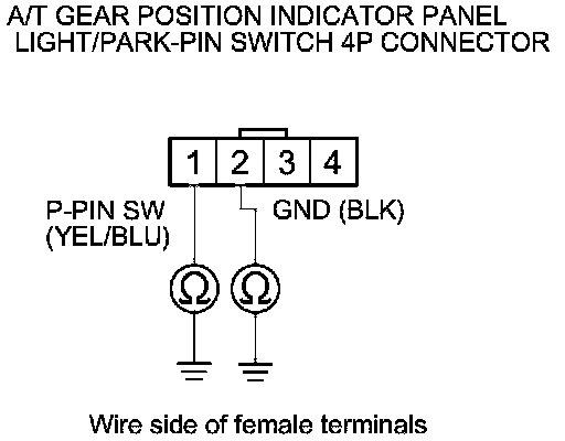13. Check for continuity between body ground and A/T gear position indicator panel light/park pin switch 4P connector terminal No. 1 and No. 2 individually.
