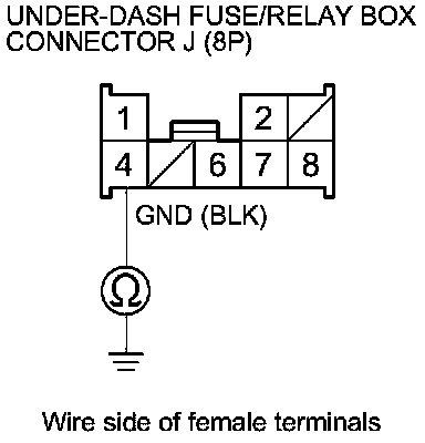 15. Check for continuity between under-dash fuse/relay box connector J (8P) terminal No. 4 and body ground.