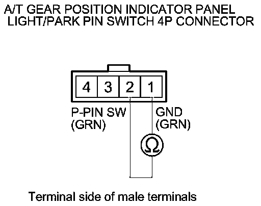 16. Check for continuity between A/T gear position indicator panel light/park pin switch 4P connector terminals No. 1 and No. 2. Do not push the shift lever button.