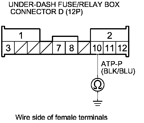 18. Check for continuity between under-dash fuse/relay box connector D (12P) terminal No. 10 and body ground.