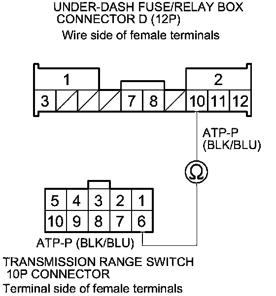 21. Check for continuity between under-dash fuse/relay box connector D (12P) terminal No. 10 and transmission range switch 10P connector terminal No. 6.