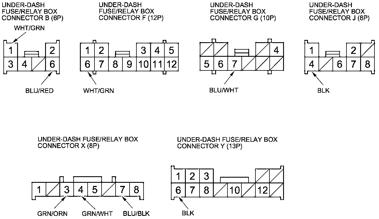 3. Disconnect under-dash fuse/relay box connectors B, F, G, J, X, and Y.