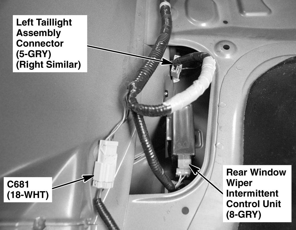 Rear Window Wiper Intermittent Control Unit Behind left quarterpanel. See Figure.
