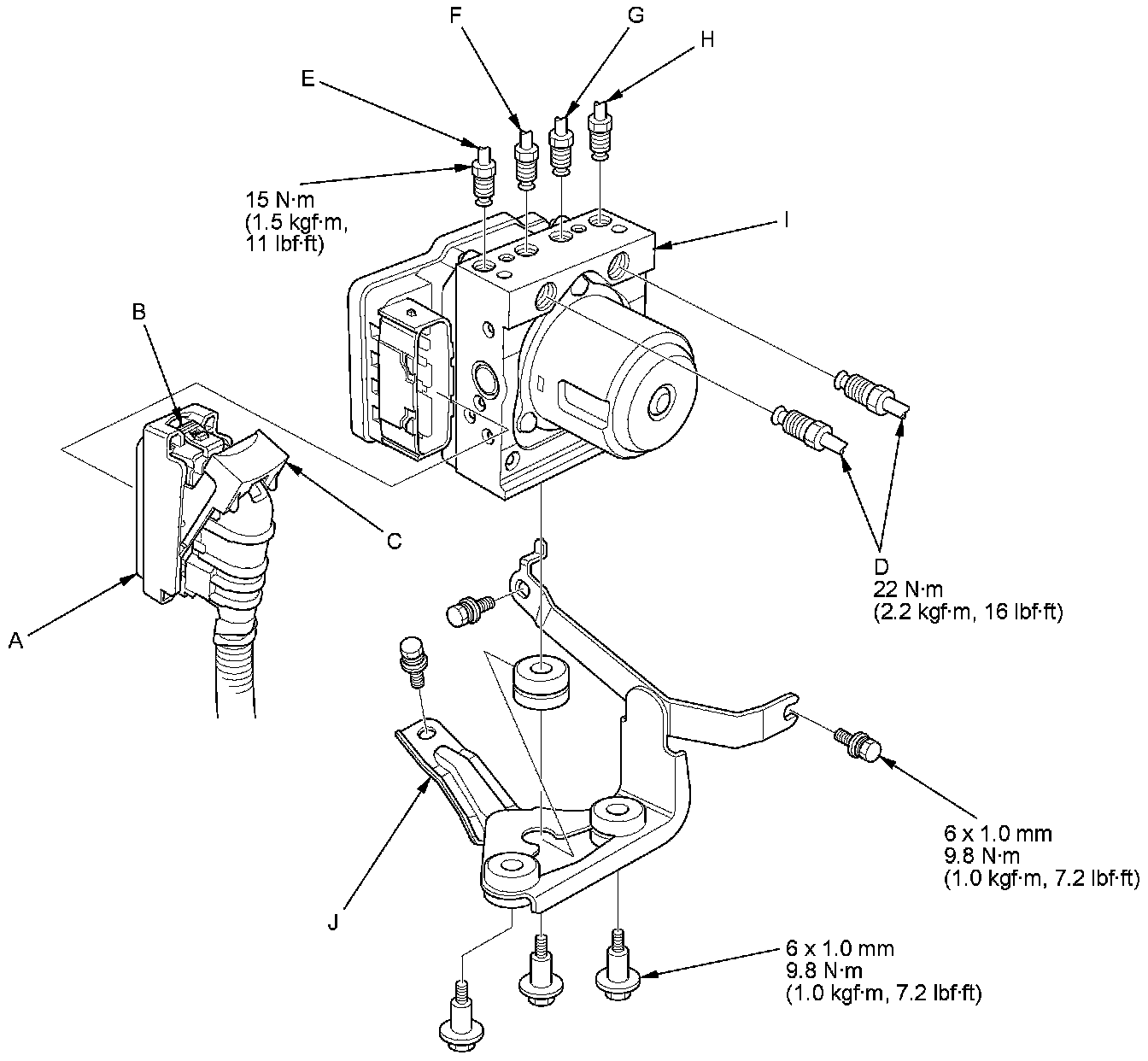 5. Remove the VSA modulator-control unit (I) with the bracket (J) from the body.