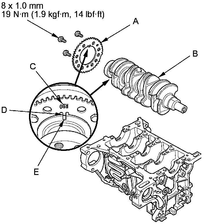 3. Install the CKP pulse plate on the crankshaft (B): with the marked side (C) facing toward the flywheel/drive plate, and align the tab (D) on the CKP pulse plate with the groove (E) on the crankshaft.