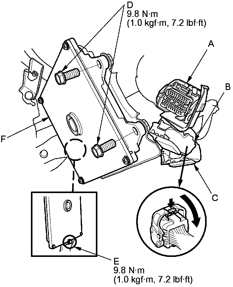 15. Disconnect ECM/PCM connectors A, B, and C, then remove the ECM/PCM (F).