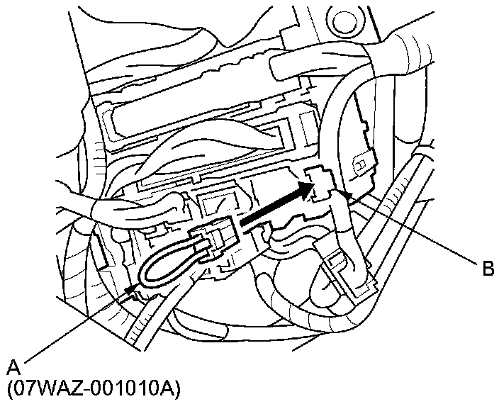 4. Connect the MPCS service connector (A) to the MICU service check connector socket (B) in the under-dash fuse/relay box.