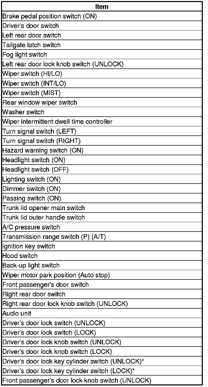 11. The following tables list the circuits that can be checked in Test Mode 2. Operate the switch that is most closely related to the problem. If the circuit is OK, the ceiling light will blink once. If the circuit is faulty, there will be no indication.