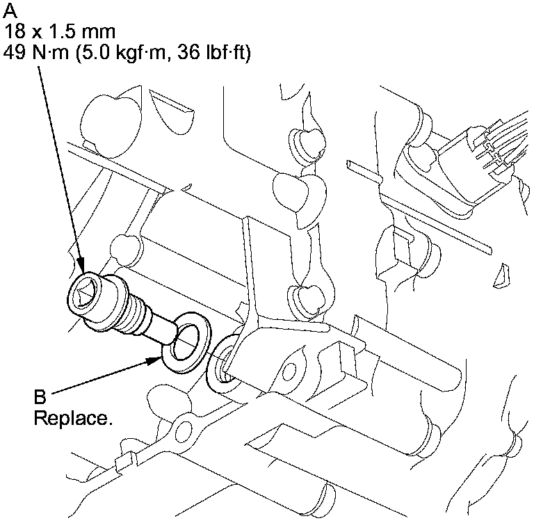 7. Reinstall the drain plug with a new sealing washer (B).