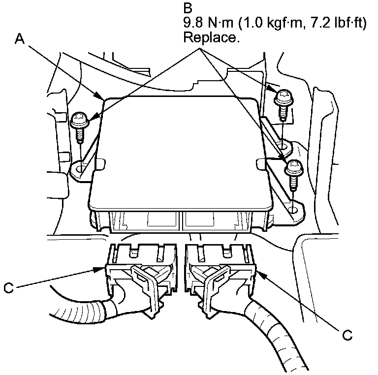 1. Install the SRS unit (A) with a new TORX bolts (B), then connect the connectors (C) to the SRS unit; push them into position until they click Service and Repair.