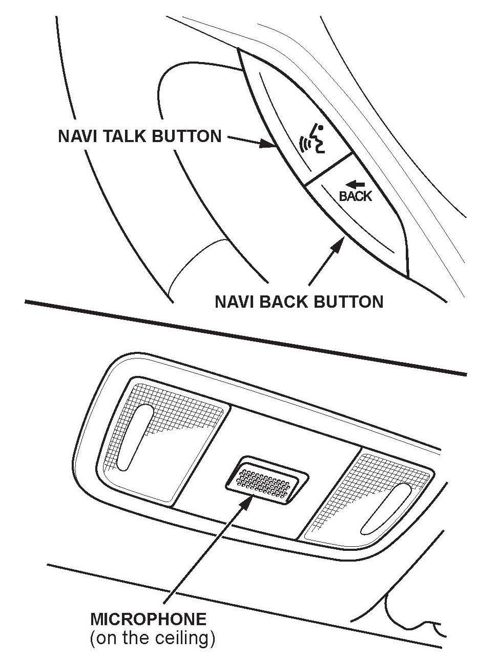The navigation system features a voice control system that allows you to operate most of the navigation and audio controls with only your voice. To interact with the navigation system, use the NAVI TALK and NAVI BACK buttons. The microphone is located in the ceiling. This is the primary way to give commands to the system. The system display buttons and touch screen are a secondary method to use the navigation system.