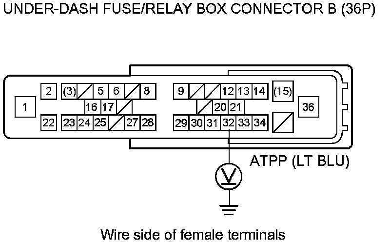 14. Measure the voltage between under-dash fuse/relay box connector B (36P) terminal No. 32 and body ground.
